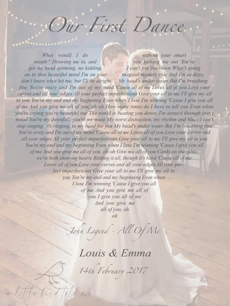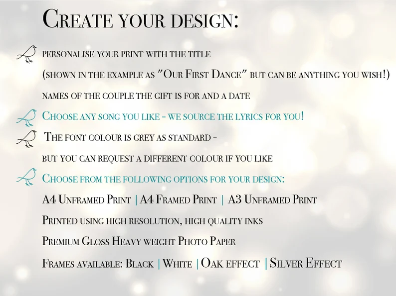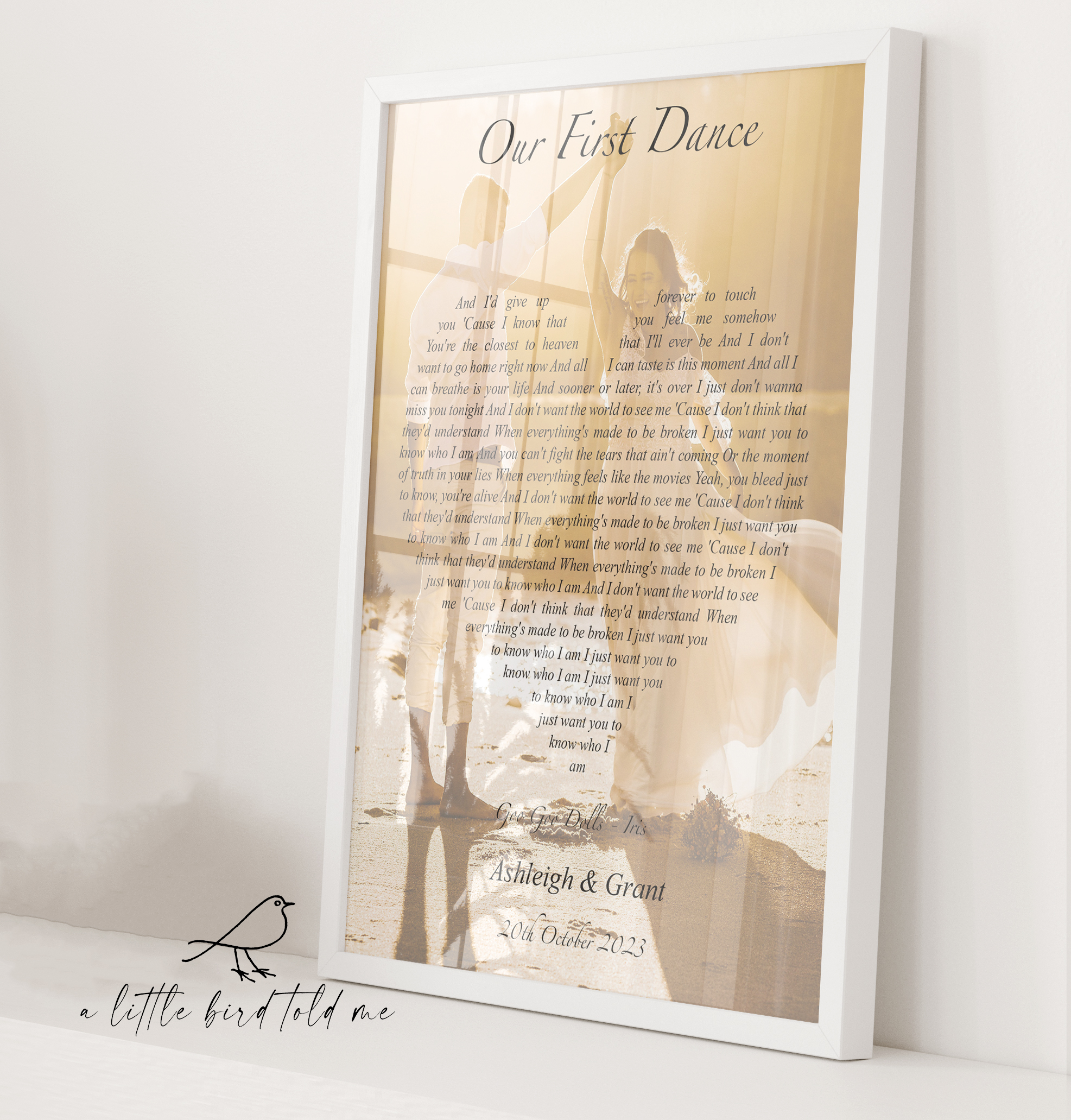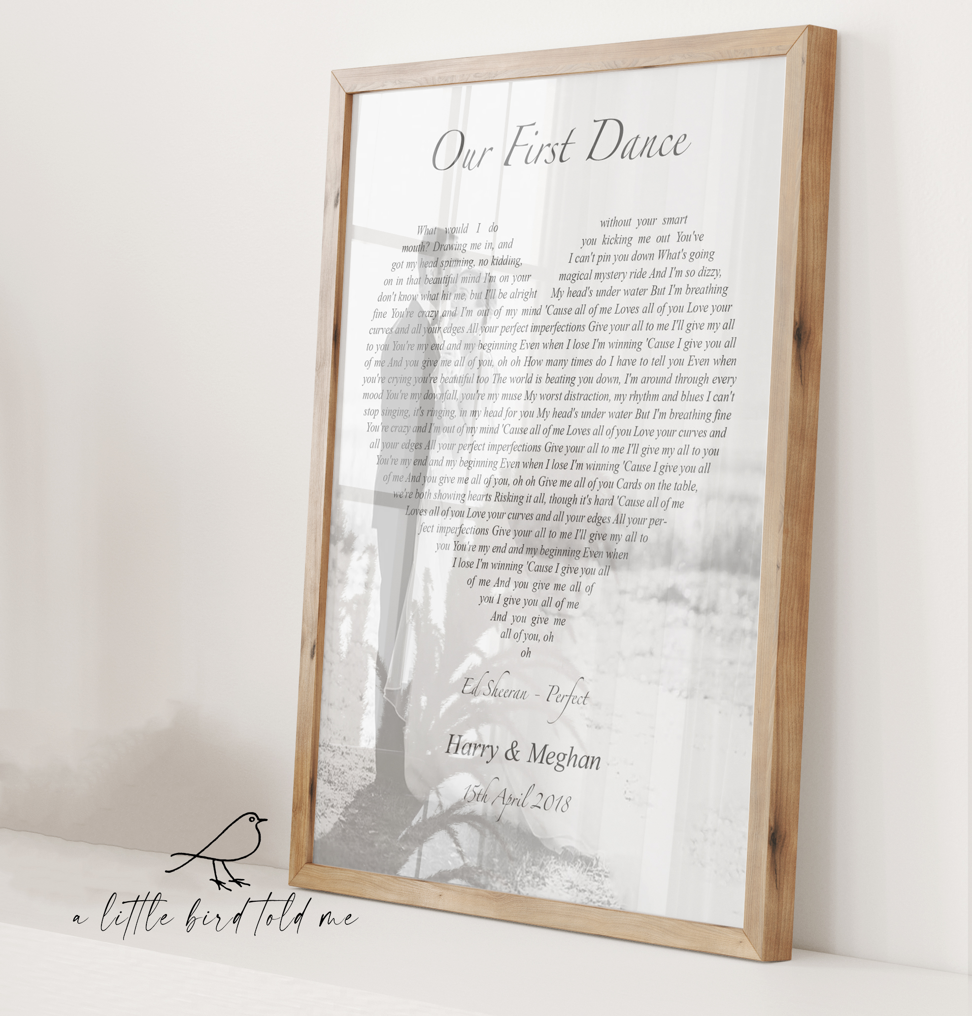 You personalise your print with the title (shown in the example as “Our First Dance” but can be anything you wish!) names of the couple the gift is for and a date. Then choose any song you like and I will create a print with the lyrics alongside your personalised information.
