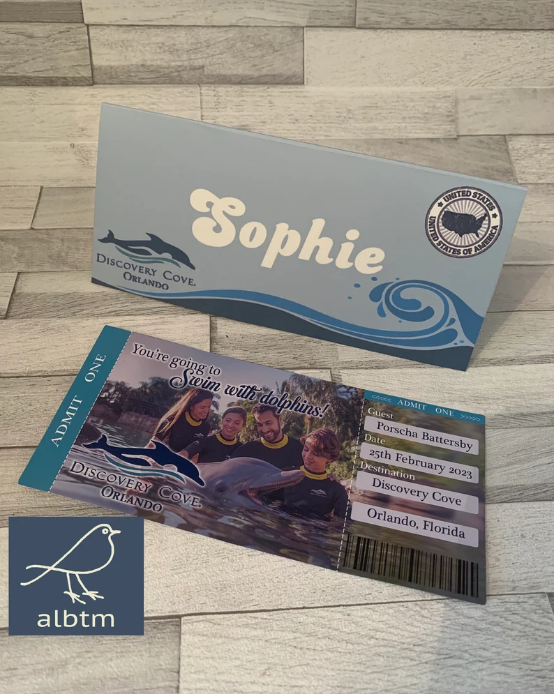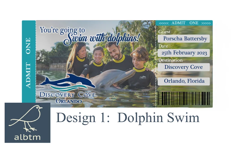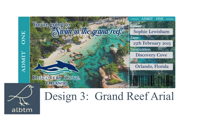 Fully personalised tickets to make that reveal extra special! Whether you are planning to swim with the dolphins or spend the day at the Grand Reef, you can customise your ticket in any way you choose. 5 different designs to choose from!